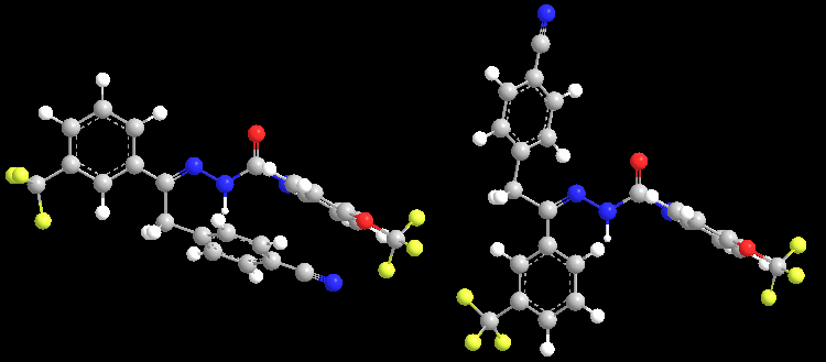 | IUPAC国际化学品标识符 (InChi) V. 1.06 | (E)-异构体 (主要成分): InChI=1S/C24H16F6N4O2/c25-23(26,27)18-3-1-2-17(13-18)21(12-15-4-6-16(14-31)7-5-15)33-34-22(35)32-19-8-10-20(11-9-19)36-24(28,29)30/h1-11,13H,12H2,(H2,32,34,35)/b33-21+; (Z)-异构体 (次要成分): InChI=1S/C24H16F6N4O2/c25-23(26,27)18-3-1-2-17(13-18)21(12-15-4-6-16(14-31)7-5-15)33-34-22(35)32-19-8-10-20(11-9-19)36-24(28,29)30/h1-11,13H,12H2,(H2,32,34,35)/b33-21- |