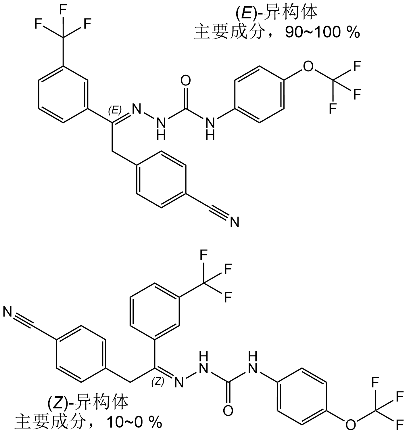 | 中文化学名称 Chinese chemical names | 90~100% 2-{(1E)-2-(4-氰苯基)-1-[3-(三氟甲基)苯基]亚乙基}-N-[4-(三氟甲氧基)苯基]肼甲酰胺 与其 10~0% (1Z)-异构体的混合物 |