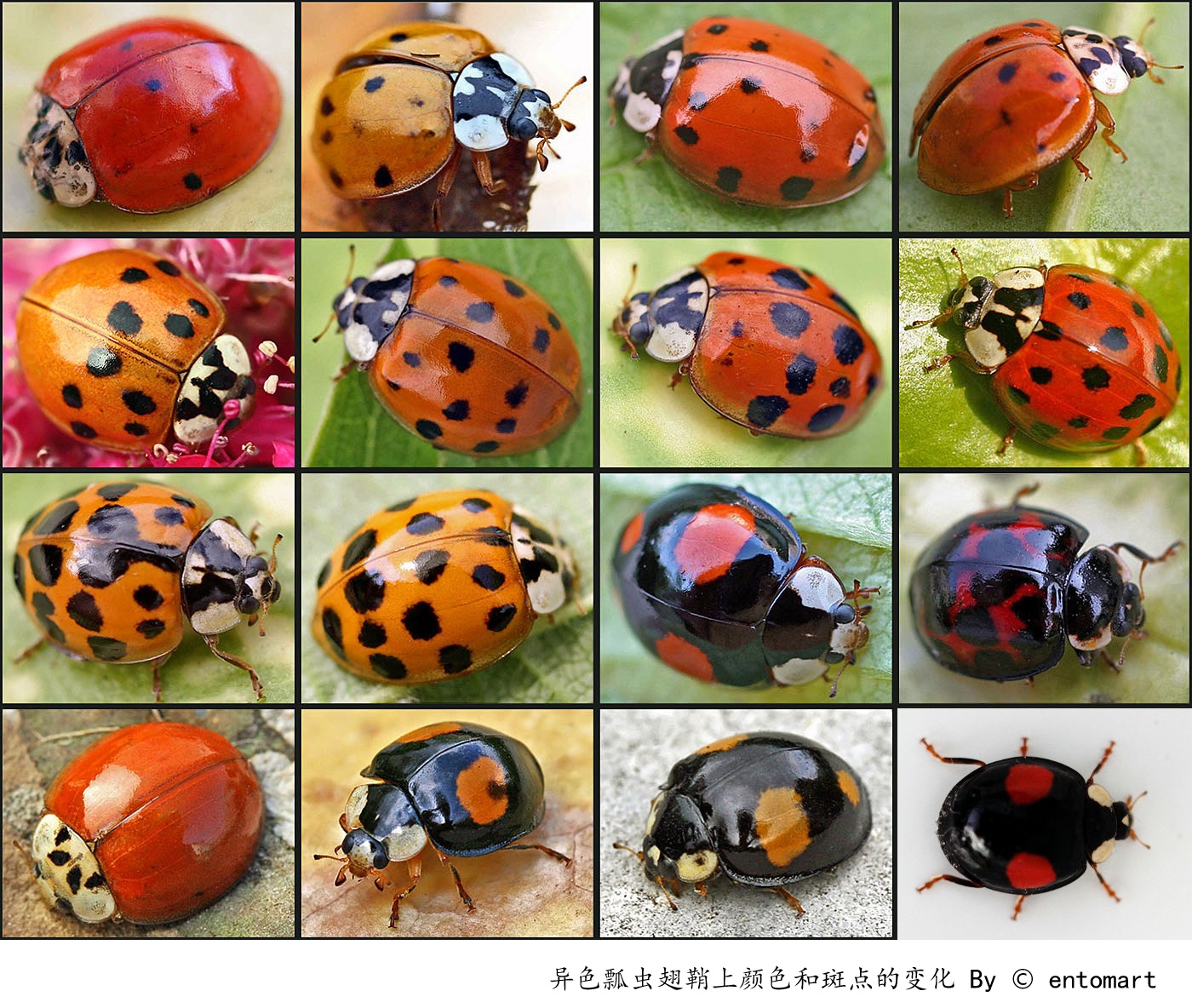 | 简 介 Introduction | 原产于东亚,卵圆形,背部显著隆起呈半球状。鞘翅颜色多样(橙、黄、黑等),斑点变异极大(已知超 100 种色型),近鞘翅末端有一明显隆起的横脊痕,是其重要识别特征。前胸背板通常有 “M” 形黑斑,但具体形态随个体差异变化。科学分类地位:真核生物域,动物界,节肢动物门,昆虫纲,鞘翅目,瓢虫科,异色瓢虫属。作为捕食性天敌昆虫,异色瓢虫以蚜虫、木虱、粉蚧等害虫为食。名气虽不及七星瓢虫,但捕食蚜虫的效率更胜一筹。 |