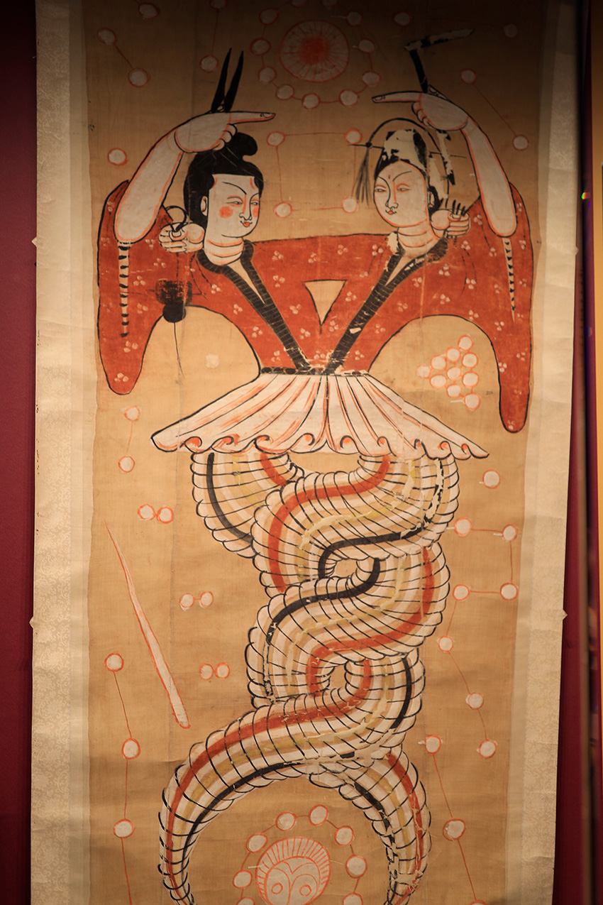 伏羲女娲图:唐代作品,纵长220厘米,横长116.5厘米。描绘的是伏羲女娲相拥交媾的景象,表现了中国古代神话传说中的人类始祖的形象以及未知的宗教含义。