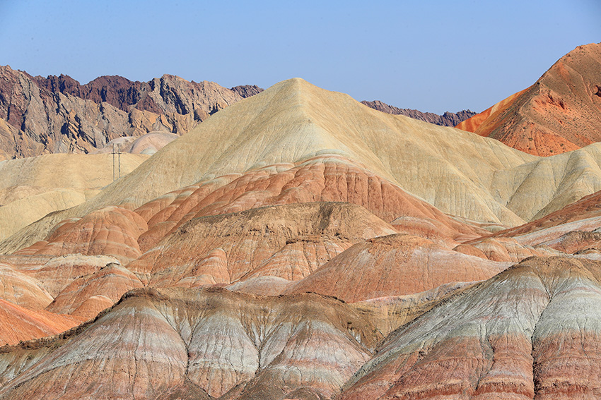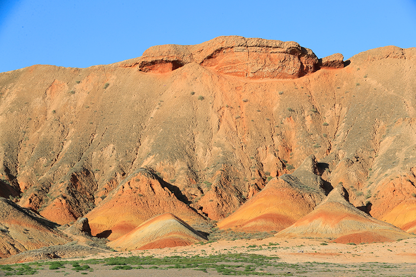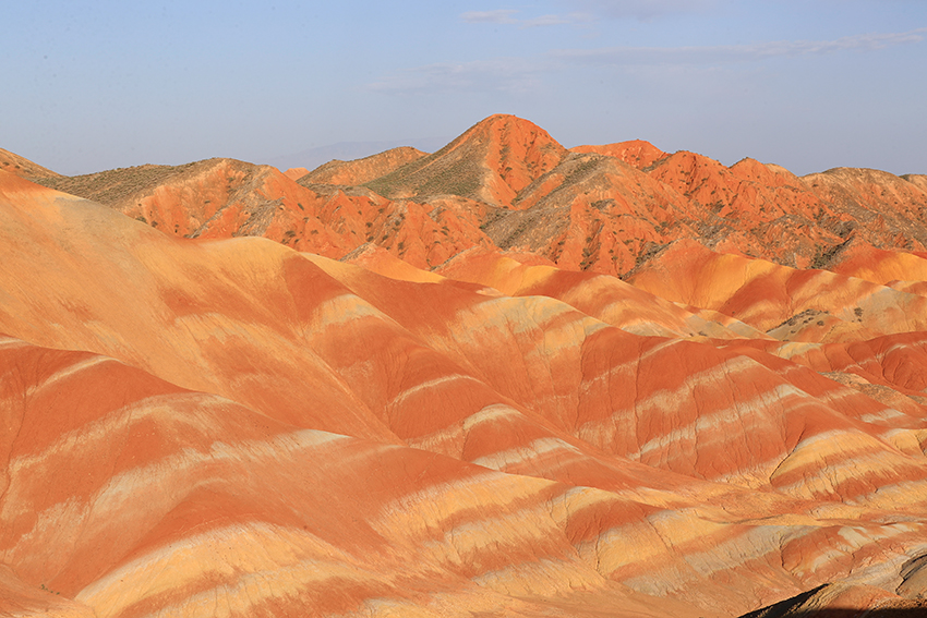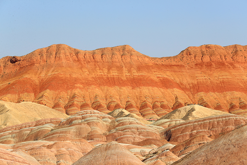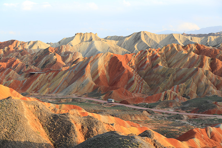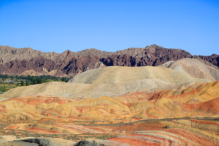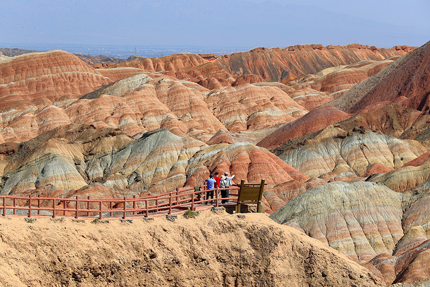 七彩丹霞为世界地质公园,它的形成可追溯到1.35亿年至6500万年前的白垩纪时期,经过喜马拉雅造山运动、流水和风力的多重侵蚀,以及长期的风化作用而逐渐形成今天的样貌。其地层主要由粉砂岩和泥质岩构成,这些岩石在干热环境中会导致矿物中二价铁被氧化为三价铁,使地层呈现红色。随着环境逐渐湿润,高价铁又被还原,地层颜色发生变化,呈现出棕黄、黄绿和青灰等色彩。七彩丹霞景区内有七彩云海、七彩仙缘、七彩锦绣、七彩虹霞、最佳摄影点、七彩熬河台和万象土林谷等7处观景台。七彩云海观景台以远观为主,达到俯瞰的效果,可以观赏到大扇贝、七彩飞霞、众僧拜佛和灵猴观海等景点。七彩虹霞台景观色彩丰富、艳丽,犹如七彩虹霞洒落在山丘之上,在夕阳余晖映衬下色彩尤为绚丽。幸运的话遇到漂亮的晚霞则更为惊艳。参观时要做好防嗮防护。
