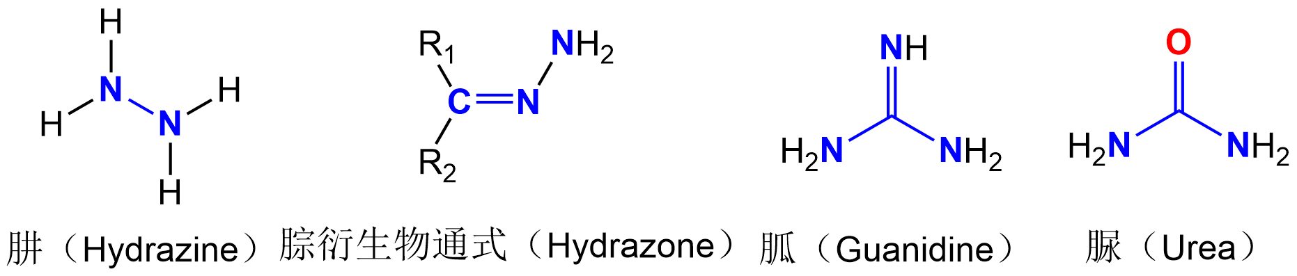 腙、胍、肼和脲的化学结构区别图: