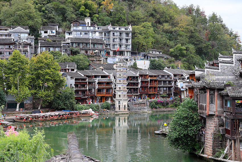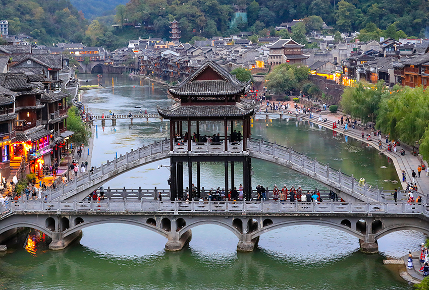 凤凰古城,历史悠久,游人如织,极易迷路。老外游客还不少。不用什么攻略,沿着沱江白天走一圈,晚上再走一圈就好了。千万记得,不要拖着拉杆箱去找你预定的江景房,一路颠簸会让你怀疑人生。白天或傍晚踩在磨得发光的青石板路上,到处都能听到微微的金属叶片的碰撞声,看到鲜艳红色三叶梅衬托的古老建筑和缓缓流过的沱江水,雪桥落座,遥想先人,无限感恩、感慨。