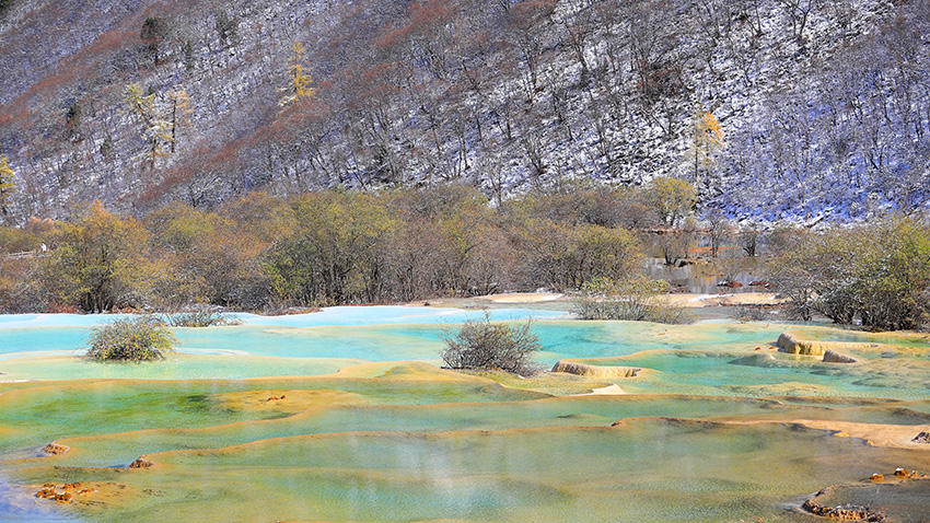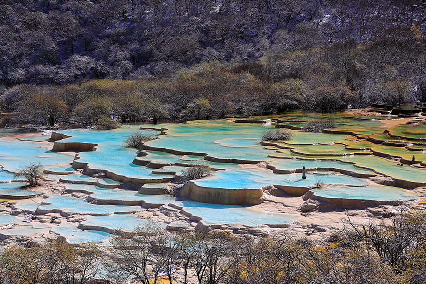 黄龙风景名胜区位于四川省阿坝藏族羌族自治州松潘县,与九寨沟相距约100千米,是中国唯一保护完好的高原湿地,总面积700平方千米,海拔1700~5588米(五彩池海拔 3576 米)。景区以彩池、雪山、峡谷、森林“四绝” 著称,加上滩流、古寺、民俗合称 “七绝”,被誉为 “人间瑶池”,1992 年被列入《世界自然遗产名录》。其核心景观集中于长约 3.6千米的黄龙沟,沟内遍布碳酸钙华沉积,形成梯田状排列的钙化彩池群,如五彩池、争艳池等,池水因矿物质含量和光线折射呈现蓝、绿、黄等奇幻色彩。