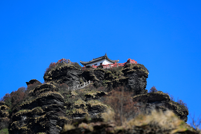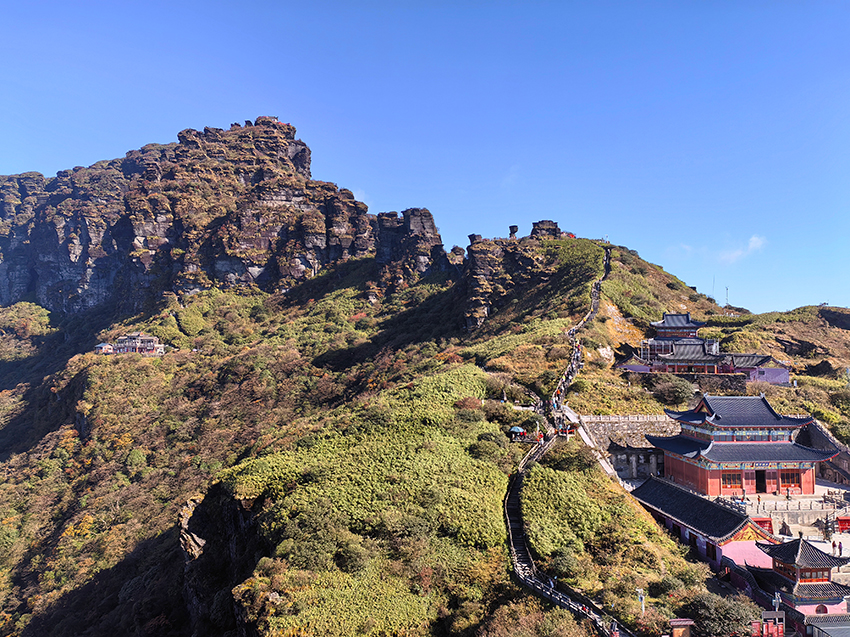 老金顶海拔2494米,是梵净山最高峰,沿途可见万卷经书、燃灯殿等景观,适合徒步爱好者。