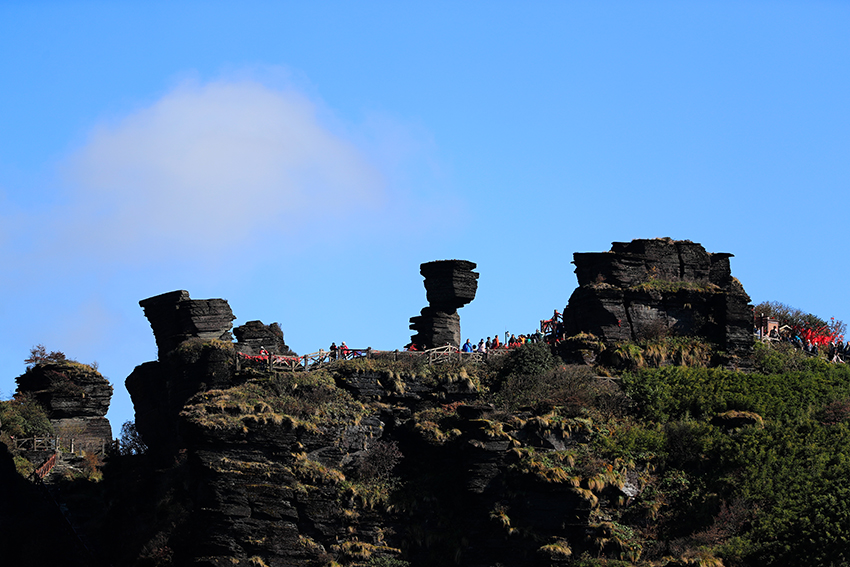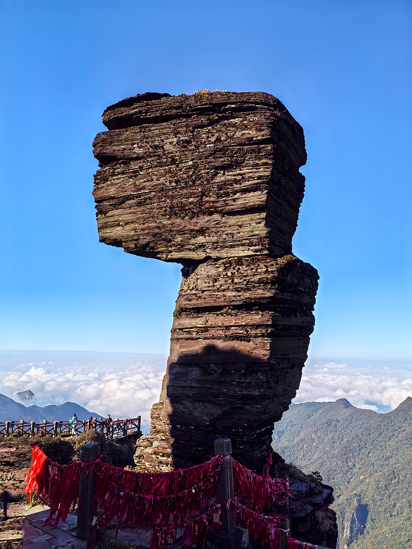 蘑菇石景区以奇石群闻名,包括蘑菇石、鹰嘴石等。蘑菇石高 10 米,上大下小,历 10 亿年风雨不倒,是梵净山标志。